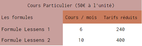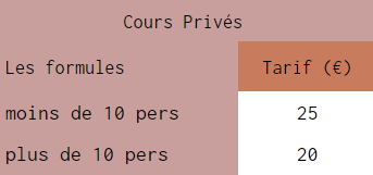 Tous les cours standards sont dispensés en particulier et en groupe sur demande.